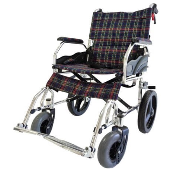 تاشو،نیمه آلومینیوم،جاپایی تاشو،دسته پشتی تاشو،ضربدری دوبل، زیردستی متحرک، دارای کمربند ایمنی، ،چرخ عقب توپر اسپرت 12 اینچ، چرخ جلو کالسکه ای،دوشاخ آلومینیوم سایز نشیمن متوسط(45 سانتی متر)